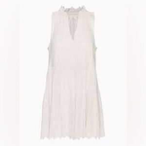 This is a sleeveless, tiered babydoll dress with a V neckline, scalloped edges and decorative stitching at the hem. It's made from lightweight, drapey fabric with a crinkle finish.