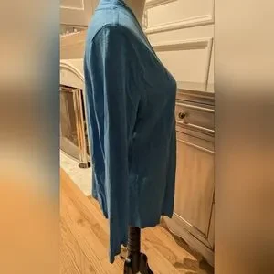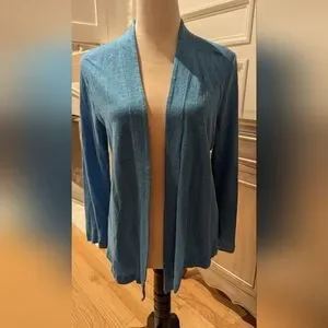 Stay comfy and stylish with this elegant bright blue open-front sweater. Perfect for layering, this versatile piece adds a touch of sophistication to any outfit. Color is brighter blue than shown in photos. worn and washed once