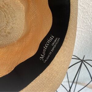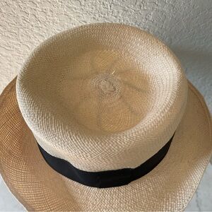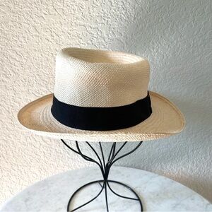 Description: original Montecristi made in Panama straw hat with black trim. Soft and pliable— meant to be rolled up for packing and traveling