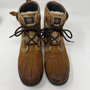 UGG Womens Waterproof Duck Boots 8.5 Brown Leather Suede Shearling Lace Up Warm