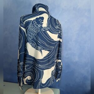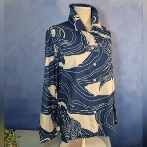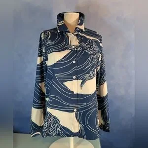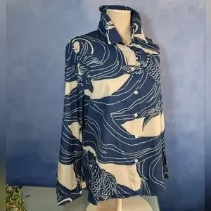 Stylish button-front blouse with a navy and white Asian Artist Inspired fish print features a classic collar and long sleeves.