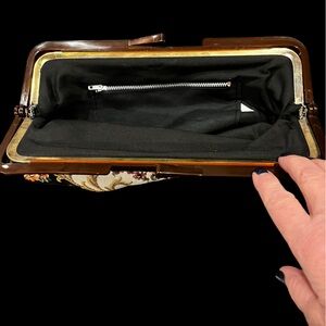 Vintage floral Tapestry clutch bag made in Hong Kong. Lucite hinged frame with kiss lock closure. Very good condition
