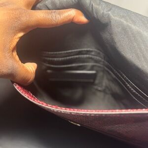 Chic Rebecca Minkoff clutch in a rich burgundy/red snakeskin print. Sleek envelope silhouette with zipper trim detailing for an elevated edge. Fully lined interior with card slots, making it perfect for nights out, events, or dressing up a simple fit.
