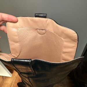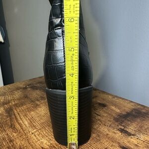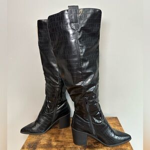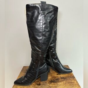 Step out in style with these sleek black croc-embossed knee-high boots. Perfect for any occasion, they add a touch of elegance to your outfit.