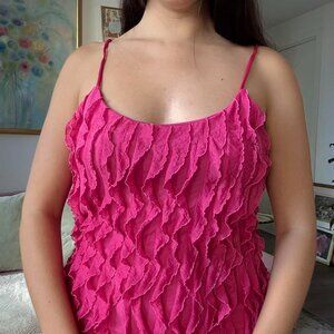 Cute, spaghetti strap mini dress, featuring pink frills throughout.