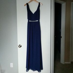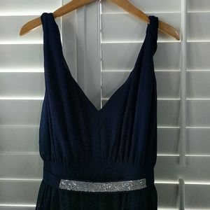Flowy, navy blue and fully lined. Hidden back zipper. Sash with silver sparkly accents.