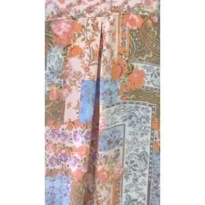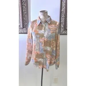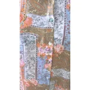 Keywords: patchwork, floral, paisley, vintage style, retro, button down, collared shirt, long sleeve, unique print, statement top, boho, artistic, feminine, multi-color