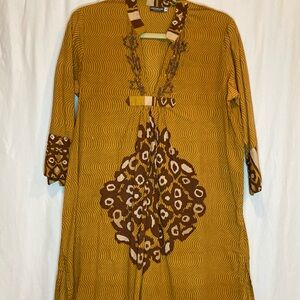 Chic long sleeve tunic dress with mustard and brown patterns. Perfect for stylish outings. Small signs of wear.