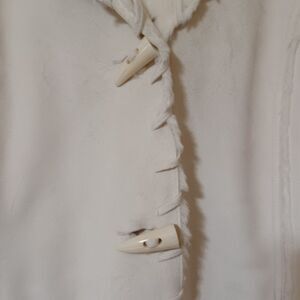 NWOT COLDWATER CREEK midi-length hooded coat, made of white faux leather and faux fur with toggle closures, pockets, and whipstitch detailing. Very warm and cozy, only worn once! Machine washable