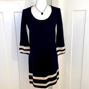 Stylish navy knit dress with cream stripe accents. Features a scoop neckline and three-quarter sleeves.