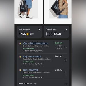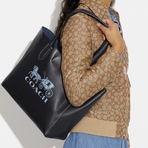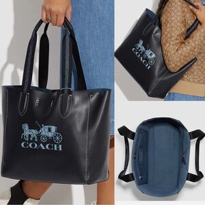 Elegant black tote bag. Features blue Coach logo. Durable and stylish design.