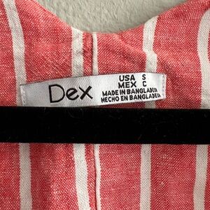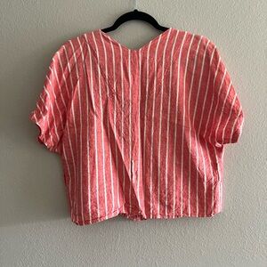 This stylish top from Dex features a vibrant pink hue and a boxy, cropped design. The short sleeves are cuffed, adding a touch of sophistication to its casual button-down style. Perfect for warm weather, this shirt offers a relaxed fit ideal for any casual outing. It is missing the tie that goes song the waist