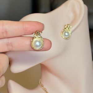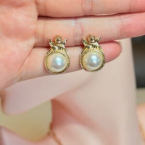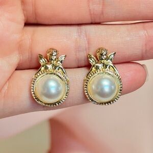 These elegant gold earrings feature a stunning pearl centerpiece, perfect for adding a touch of sophistication to any outfit.