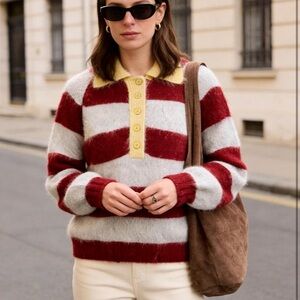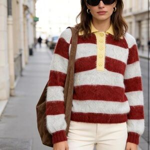 Stay cozy and stylish with this striped red and gray sweater. Perfect for any casual outing.