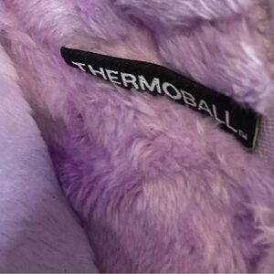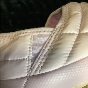 Comfortable quilted slippers with soft purple lining. Ideal for relaxation. Faux fur is very soft and cozy inside. Thermoball & memory foam sole inside. Easy slip on with back cloth hook. Great condition.