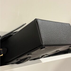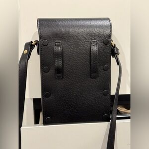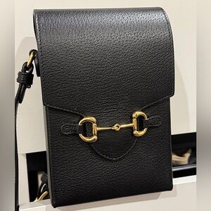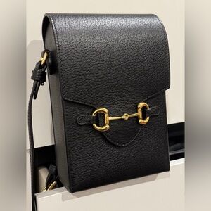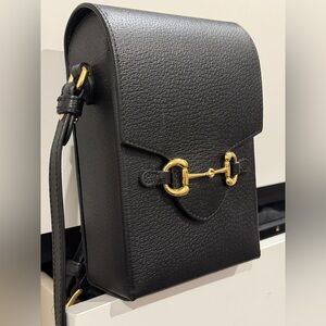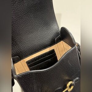- Features: Magnetic flap closure, black leather material, front gold-tone horsebit detail, adjustable shoulder strap