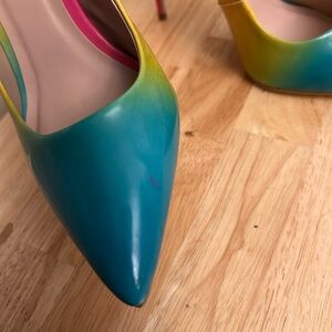 Eye-catching ombre heels with a vibrant pink and teal design. Perfect for adding flair to any outfit.