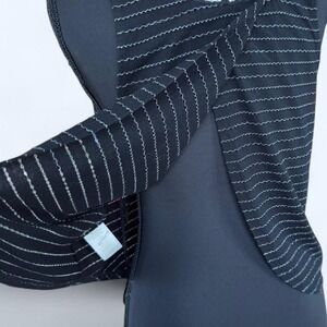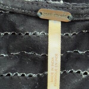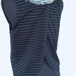 Stunning Free People sleeveless top featuring an intricately beaded neckline with metallic and iridescent details. Black base with subtle stitched striping and an asymmetrical, draped hem. Lightweight and flowy with a true boho-luxe, artwear feel.