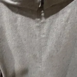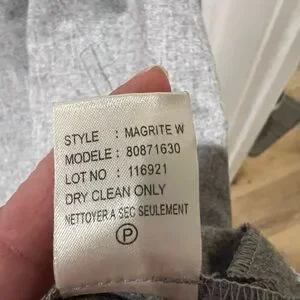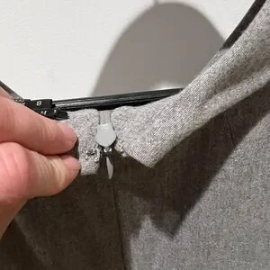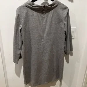 Luxurious gray dress with 3/4 length sleeves. Perfect for a polished look. Cowl neck. Working pockets. Zip and hook and eye closures.