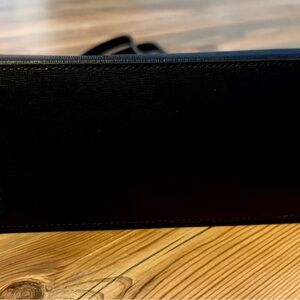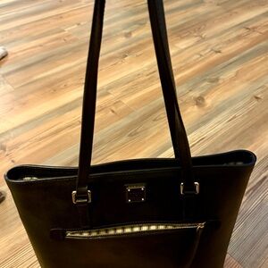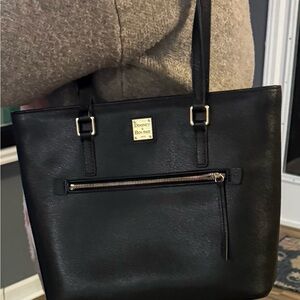 Chic black leather tote with front zipper pocket. Ideal for daily use.
