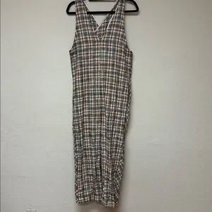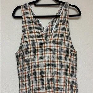 Stylish plaid jumpsuit featuring a blend of blue and orange. Perfect for casual outings or a day out with friends.