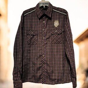 Upgrade your wardrobe with this stylish plaid button-down shirt. Featuring a unique badge, it's perfect for casual outings.
