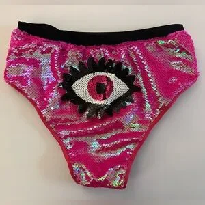 Vibrant pink sequin bikini bottom with eye design. Adds sparkle and fun.