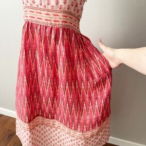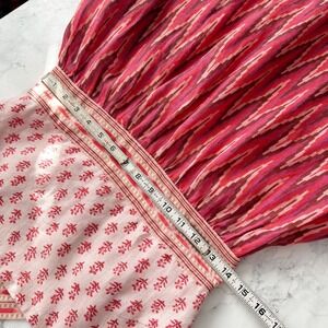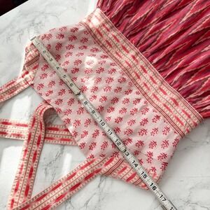 A Faherty midi dress of 100% linen. Indian block print and floral pattern. Stunning red and pink hues. Wide straps that crisscross in back and are adjustable via button. Hidden side zip closure. And it has pockets!