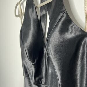 Jenny Woo Evening Gown Womens 8 Black Satin Halter Maxi Formal Dress Elegant