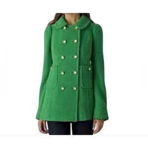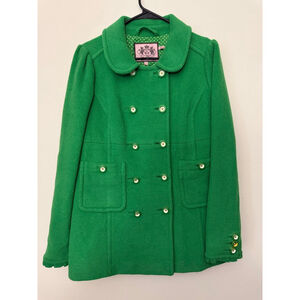This is a pre-owned women's Juicy Couture pea coat in a vibrant green color, size L. The coat features a double-breasted design with gold-toned buttons, some of which have a white enamel ring. It has a rounded collar, two front patch pockets, and decorative buttons on the cuffs and back. The interior lining is white with green polka dots. The fabric appears to be a textured wool blend. Coat missing some white snap part of the button…does not affect the coat at all BARELY NOTICEABLE… hence price!