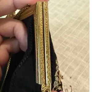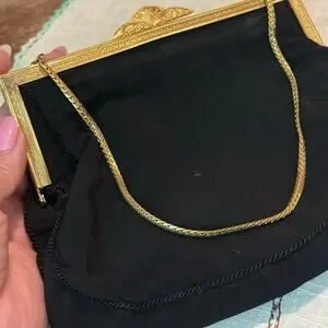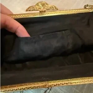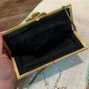Gold-tone frame shows slight misalignment at the clasp and along the edge β a subtle quirk of vintage construction that does not affect function or silhouette. There are also faint markings on the back fabric (see photo), consistent with gentle pre-loved wear.