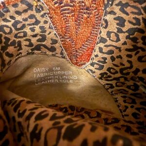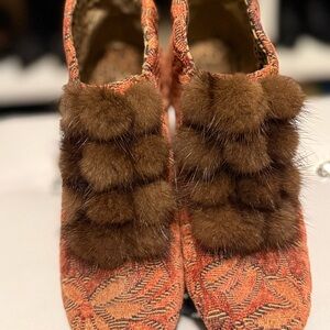 Women’s BACI brocade/tapestry upper with real mink for pom-poms. Slip on style with stretch on side 2 inch heel on the inside 3 inch heel on the outside very DowntonAbbey.