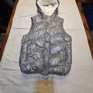 Y2K American Eagle silver puffer vest with soft lined hood,flannel lined and American Eagle patch! No flaws! SIze Large #winteraccessories #y2k #vintage #americaneagle