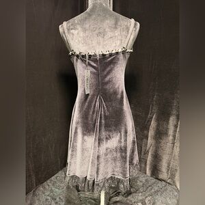 Chic black velvet mini dress. Features delicate lace trim and cross detail. Perfect for a bold statement.