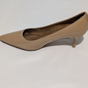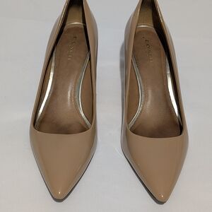 Elegant beige patent leather heels by Coach. Features pointed toe and sleek design. Ideal for versatile styling.