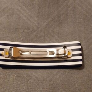 Stylish hair clip with navy and white stripes. Perfect for adding a chic touch to any hairstyle.