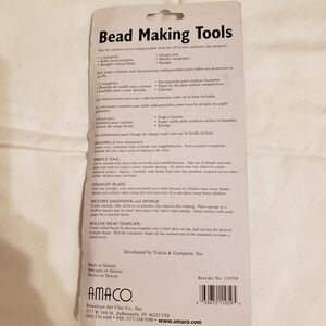 Amaco bead making tools set. It contains two mandrels (2 diameter), dimple tool, straight cutting blade, roller bead template, wet/dry sand paper, sponge, & roller bead template. Perfect for crafting and jewelry making.