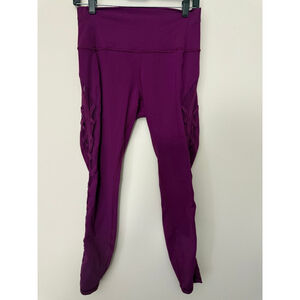 These are a pair of pre-owned Lululemon women's leggings in a vibrant purple color, size 8. They feature a high-waisted design and a full-length cut. A distinctive detail is the intricate mesh paneling with a criss-cross pattern running down the outer side of each leg. The fabric appears to be a stretchy, athletic material. The Lululemon logo is visible on the back waistband.