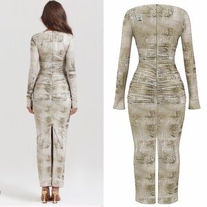 Strategic ruching and a soaring back vent detail this long-sleeve maxi dress that features an elegant bateau neck and vintage-inspired print.