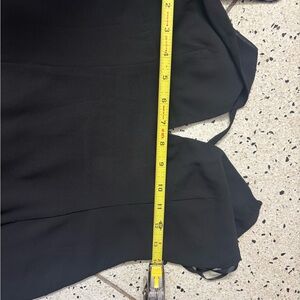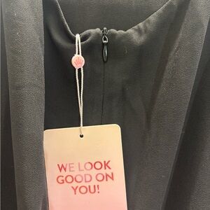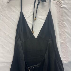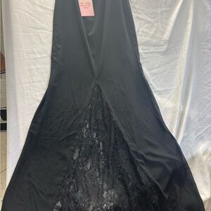 Chic black dress with a backless design. Features lace accents and a side slit. Perfect for evening events.