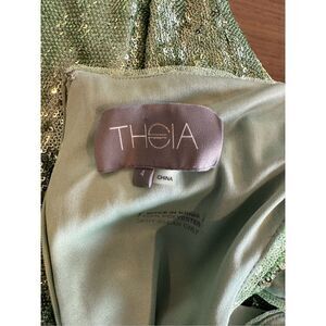 Step into the spotlight with this breathtaking Theia Evening Gown. Featuring a shimmering seafoam/mint green hue, this floor-length gown is adorned with all-over sequins that catch the light from every angle. The elegant cap sleeves and cowl neckline create a timeless, sophisticated silhouette perfect for black-tie weddings, galas, or holiday parties.
