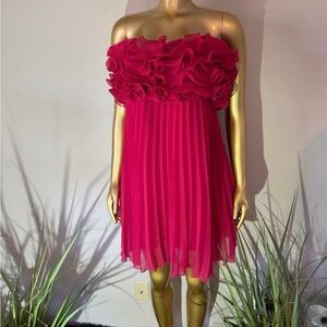 Elegant off-shoulder dress with ruffle detailing. Pleated design. Perfect for special occasions.