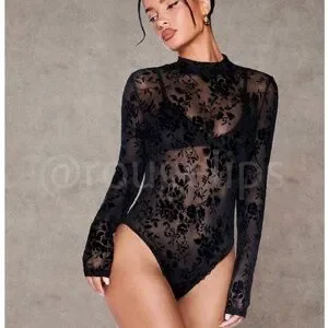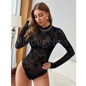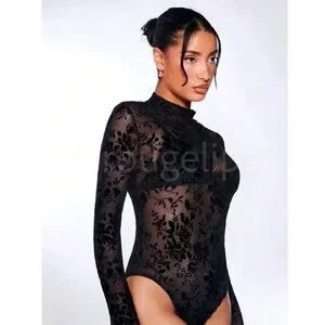Black Mesh Lace Sheer Long Sleeve Bodysuit