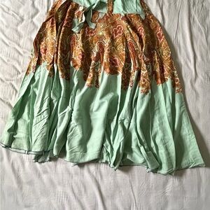 Elevate your style with this chic A-line skirt featuring a vibrant paisley print. The light green hue adds a refreshing touch to your ensemble. elastic at back makes it free size.