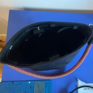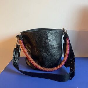 Comes with both the colorful rope handle and the adjustable leather crossbody strap.