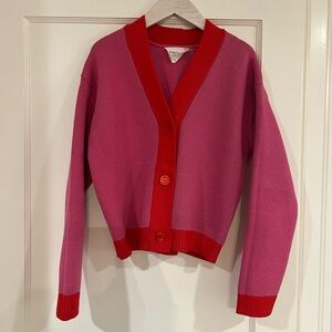 Elevate your wardrobe with this chic pink and red cardigan sweater by Hyacinth House, purchased based from Tuckernuck. Perfect for any occasion, it combines comfort with style with a Birds Eye stitch. 3 buttons center front placket. Boxy fit with 21” center back length and 19 1/2” chest. 67/33 cotton/poly. Hand wash, line dry. No signs of wear.