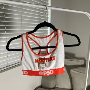 Stylish sports bra with PSD branding. Features white and orange colors. Comfortable racerback style.