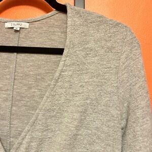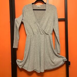 Cozy and flattering gray fleece dress with a faux wrap V-neckline and long sleeves. Features a defined waist and flowy skirt for an easy, feminine fit. Super soft and comfortable—perfect for casual wear, lounging, or dressing up with boots and a jacket.