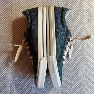 Stylish blue floral sneakers with white laces. Comfortable and trendy design.