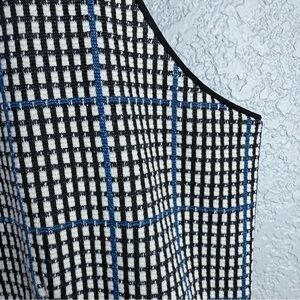 Tags: preworn, Ann Taylor dress, plaid dress, sleeveless dress, split neck dress, sheath dress, work dress, office siren, black white blue, checkered, lined dress, tailored, knit dress, professional, wear to work, business casual, structured dress, corporate style, elegant, classic style, desk to dinner, career wear, mod inspired, minimalist, chic, contemporary office, retro touch, timeless, wardrobe staple, polished look, size 4, petite-friendly, modern professional, corpcore, grid print, windowpane check, fitted, career chic